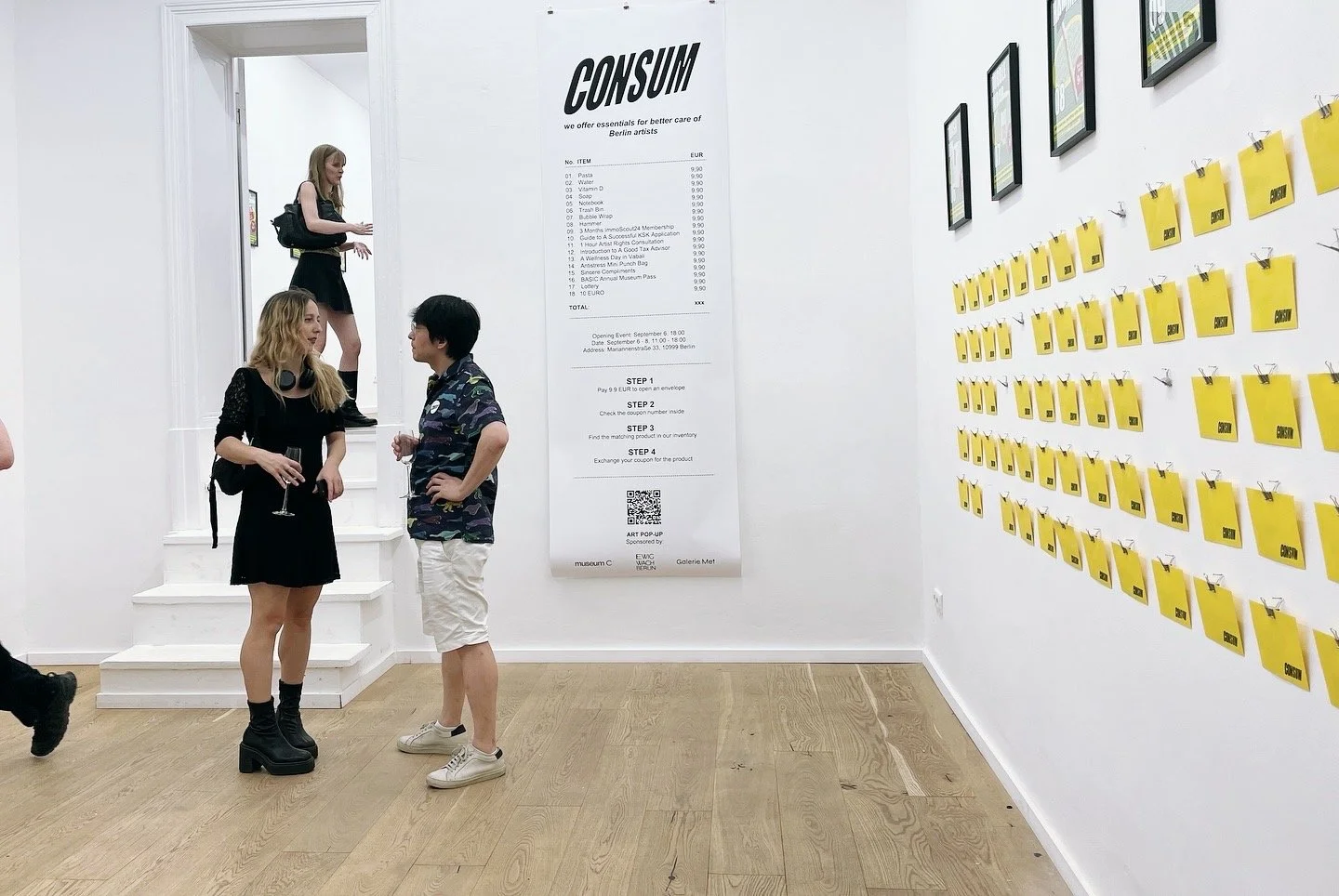 CONSUM draws inspiration from “Konsum”, the consumer cooperative shops from the GDR's planned economy era. These center-controlled supply facilities ensured equal resource distribution to all, but only at a subsistence level. The ironic parallel between "equality" in Konsum and the current conditions faced by Berlin artists serves as the foundation for CONSUM. It is also the testing ground to explore a neutral perspective on commerce. During the exhibition, CONSUM will transform Galerie Met into a pop-up store offering essential items for Berlin artists. All products are priced the same at 9.9 EUR, offering buyers an equal opportunity to open one of the envelopes, containing a CONSUM voucher. Every voucher is redeemable for a designated product from the inventory.